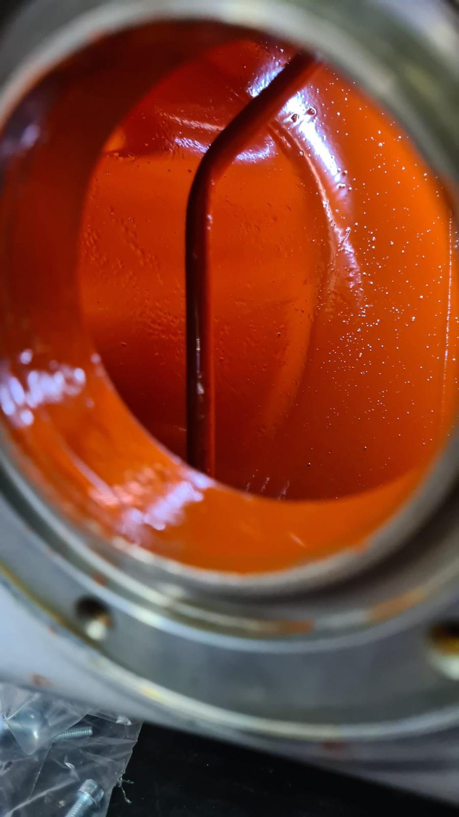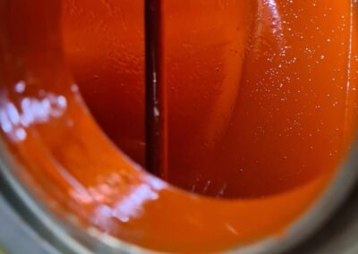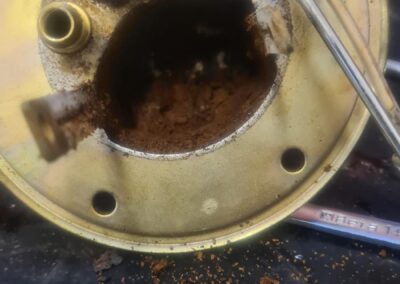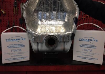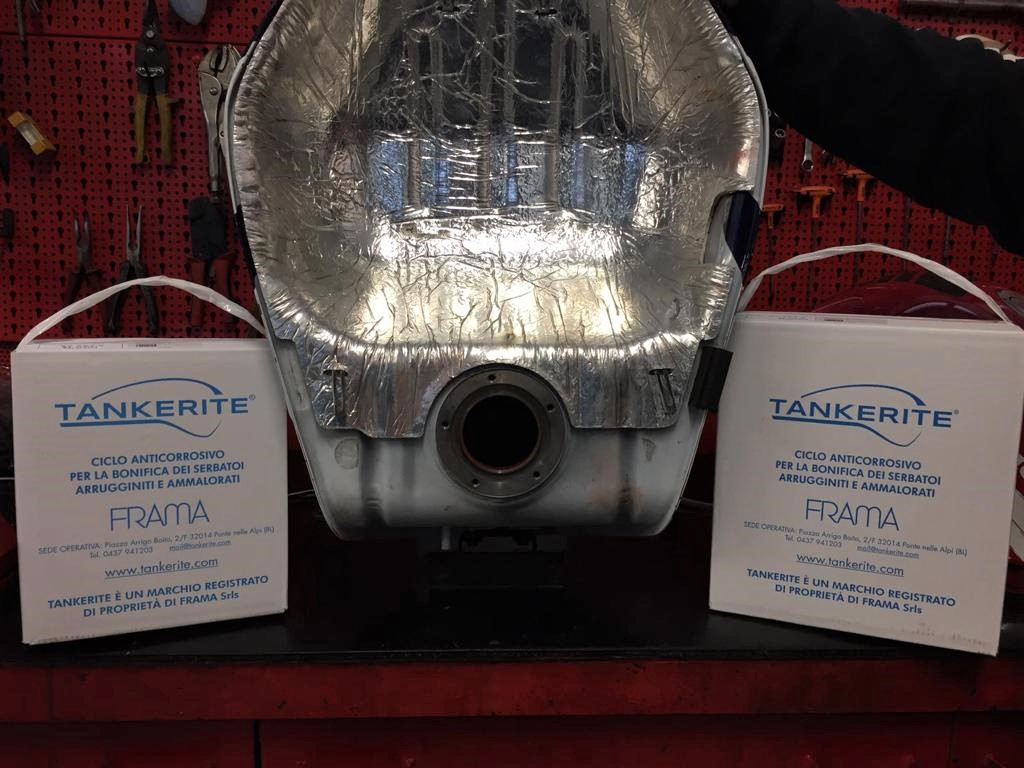 2. A questo punto procediamo con la fase di decapaggio della ruggine. Introdurre l’antiruggine ed agitare. Chiaramente, in caso di serbatoi molto usurati con forti incrostazioni di ruggine, agitare ripetutamente in modo energico. La ruggine normalmente, in base al suo livello di avanzamento, sparisce dopo un paio d’ore. Una volta terminato questo procedimento, risciacquare abbondantemente il serbatoio con acqua corrente. Asciugare il serbatoio con aria compressa o aiutandosi con un ulteriore lavaggio di alcool etilico a 90°, il quale è in grado di assorbire tutti i residui di umidità all’interno del serbatoio. Nel caso in cui all’interno del nostro supporto, siano stati utilizzati additivi oleosi, procedere anche con un lavaggio sgrassante con diluenti nitro o acetone.
