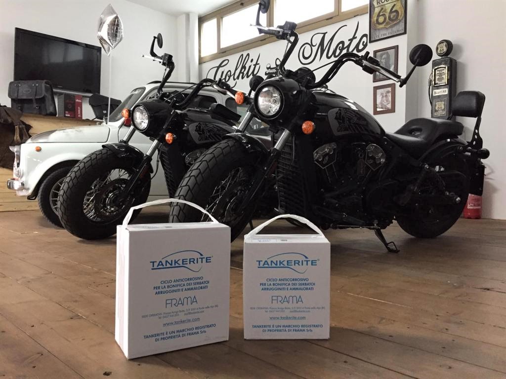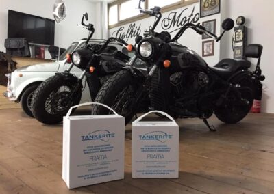 A questo punto versare il composto ottenuto all’interno del serbatoio e ruotarlo più volte e lentamente su tutti i lati per permettere una migliore distribuzione ed adesione. Reclinare in avanti il serbatoio per evitare di otturare i fori benzina con la resina. Il ciclo Tankerite essicca in genere in 24/48 ore ed è necessario farlo essiccare a temperatura ambiente. Ci raccomandiamo di NON UTILIZZARE BENZINA PRIMA DI UNA SETTIMANA!